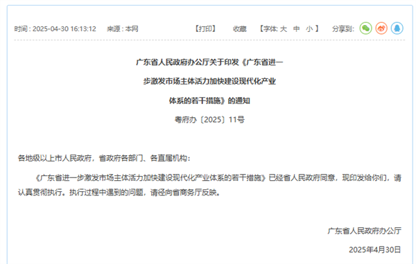 4月30日,广东省人民政府办公厅印发《广东省进一步激发市场主体活力加快建设现代化产业体系的若干措施》(以下简称《措施》)。